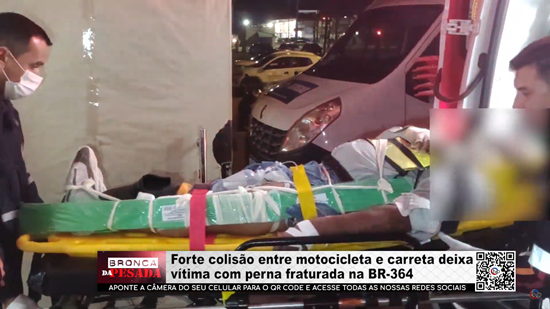 Forte colisão entre motocicleta e carreta deixa vítima com perna fraturada na BR-364 - Vídeo