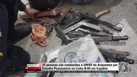 Em uma ação orquestrada, sem uso progressivo da força, policiais militares do 7° Batalhão de Polícia Militar (BPM), de Ariquemes, retirou um grupo de invasores de terra e apreendeu uma arma de fogo numa propriedade rural no município de Cujubim/RO. Ao todo 25 pessoas foram detidas. A ação realizada teve o objetivo de desarticular e desestimular a grilagem de terras naquela região.