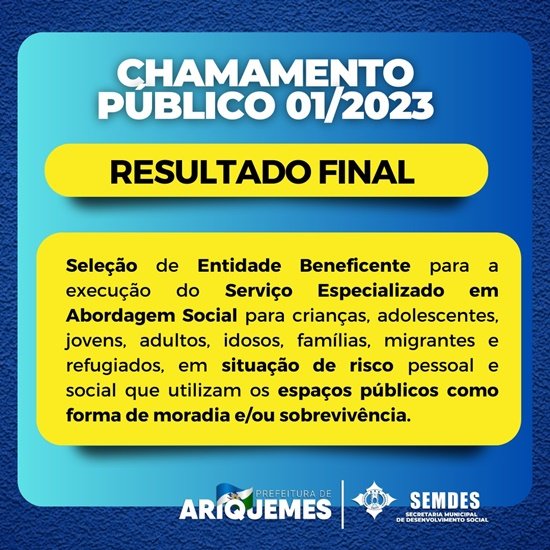 A Prefeitura de Ariquemes, através da Secretaria Municipal de Desenvolvimento Social - SEMDES, divulgou nesta quinta-feira (17), o resultado final do Edital de Chamamento Público, para celebrar termo de colaboração com Entidades Beneficentes, que ofertem serviço especializado em Abordagem Social.
