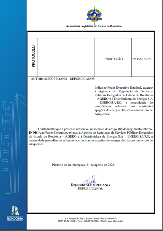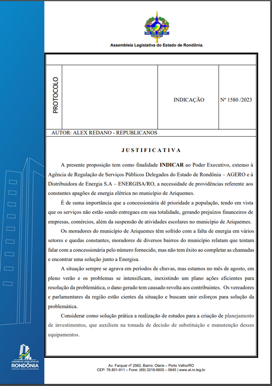A presente proposição tem como finalidade INDICAR ao Poder Executivo, extenso à Agência de Regulação de Serviços Públicos Delegados do Estado de Rondônia – AGERO e à Distribuidora de Energia S.A – ENERGISA/RO, a necessidade de providências referente aos constantes apagões de energia elétrica no município de Ariquemes.