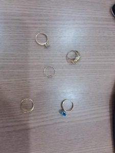 Durante a abordagem foi encontrado com ele cinco anéis de ouro semelhantes a um roubo que aconteceu nesta última terça-feira (22/08). Ao ser questionado sobre a procedências das joias, este informou que um indivíduo tinha deixado o anel em sua residência para ser derretido.