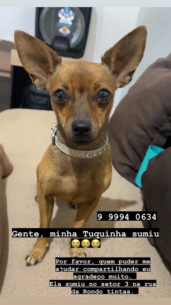 Desapareceu da residência de sua dona localizada no Setor 03 na rua da Rondon Tintas. Esta cachorrinha aparentemente da raça Pinscher de pelagem marrom, que atende pelo nome de Tuquinha. Segundo informações ela foi vista pela última vez na Av. Capitão Silvio por volta das 16:00 horas. O pet é um animal muito dócil e querido por sua dona que está muito aflita. Qualquer informação do paradeiro de Tuquinha entre em contato com Cláudia, dona do pet pelo WhatsApp: (69) 9 9994-0634.