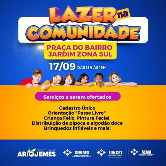 Neste domingo, dia 17/09 teremos o Projeto "Lazer na Comunidade" na praça do Bairro Jardim Zona Sul!