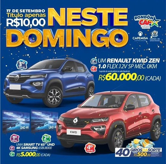 O Rondoncap quer ver você de carro zero km na garagem ainda em setembro e neste domingo dia 17.09, tem sorteio de 2 carros e o título só 10 reais!