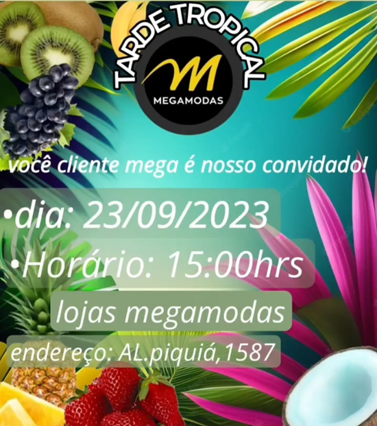 Você cliente Mega modas está mais que convidada a participar da nossa Tarde Tropical!