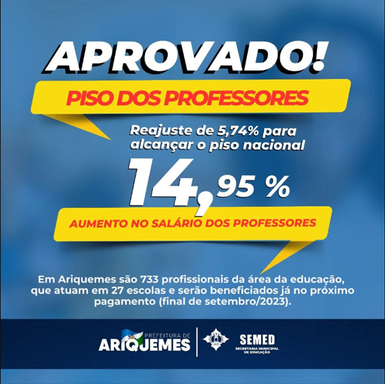 Ao todo, 733 professores que atuam na rede municipal de ensino em 27 escolas públicas de Ariquemes, serão contemplados. O reajuste já será pago a partir do pagamento do mês de setembro de 2023.