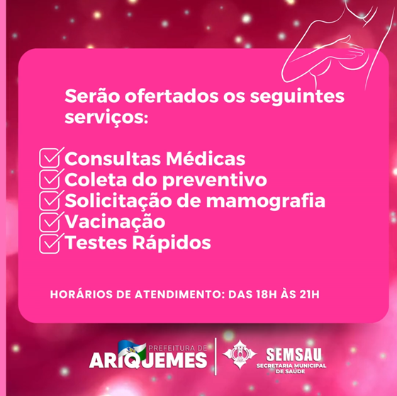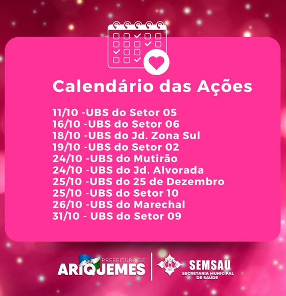 Cronograma de ações noturnas nas Unidades Básicas de Saúde-UBS, durante o mês de outubro, com todo carinho para você mulher se cuidar.
