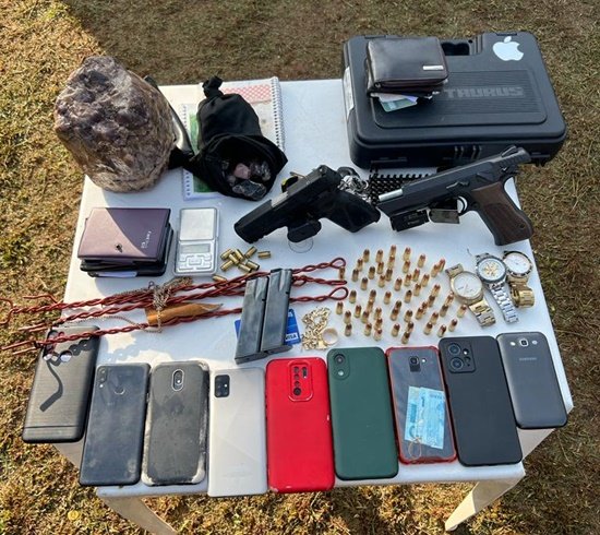 Foram cumpridos 10 mandados de busca e apreensão em Rondônia e no Paraná, expedidos pela Subseção Judiciária de Vilhena/RO. Durante a ação, foram apreendidas armas de fogo, munições, pedras sem comprovação de origem, celulares, bem como apetrechos utilizados na atividade de garimpo.
