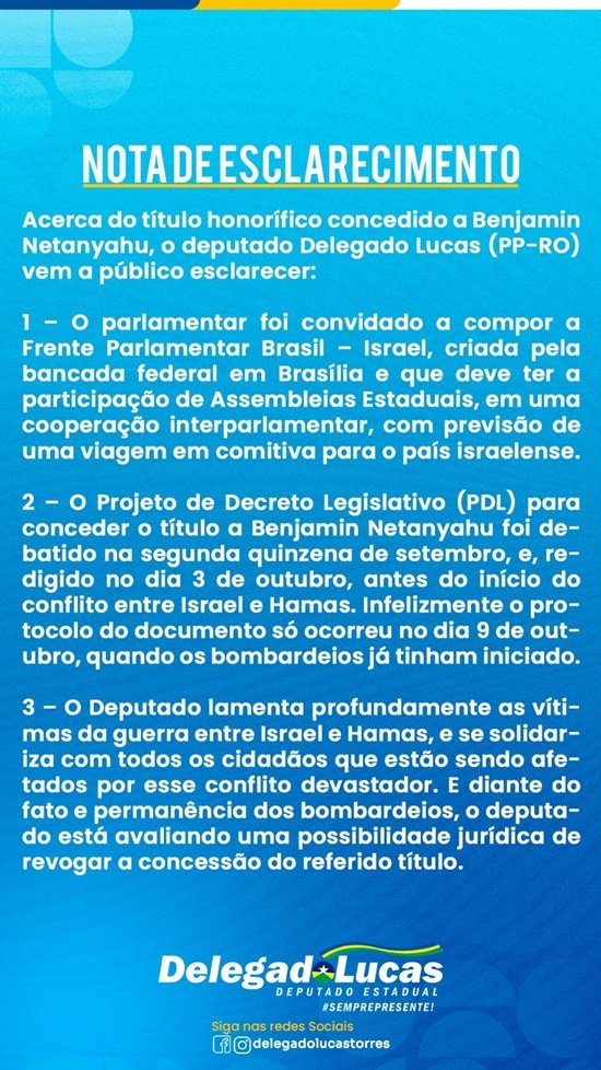 Acerca do título honorífico concedido a Benjamin Netanyahu, o deputado Delegado Lucas (PP-RO) vem a público esclarecer: