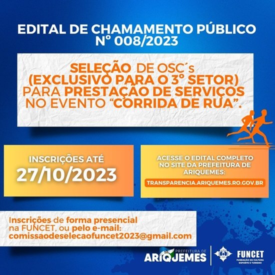 Na manhã desta terça-feira (17), a Prefeitura de Ariquemes, através da Fundação de Cultura, Esporte e Turismo - FUNCET, divulgou o Edital de Chamamento Público 008/2023, para a seleção de OSCs que prestem serviços no evento "Corrida de Rua", previsto para ser realizado na 2ª quinzena do mês de novembro/2023.