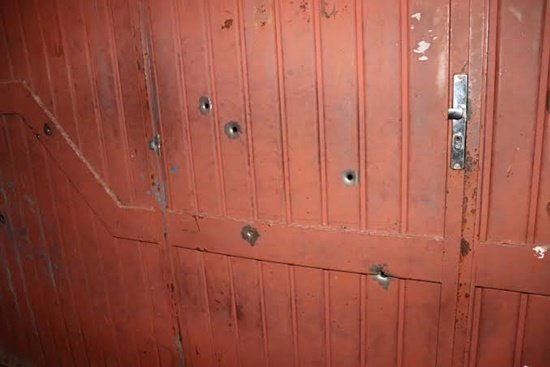Quando telefonou para a PM e saiu de casa viu que o portão estava todo perfurado.