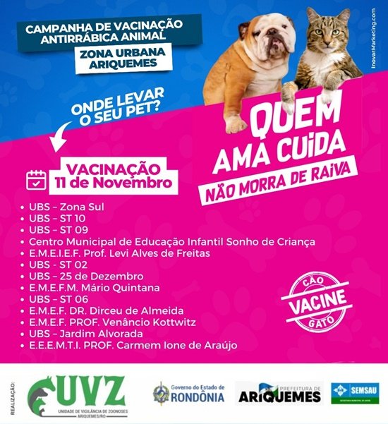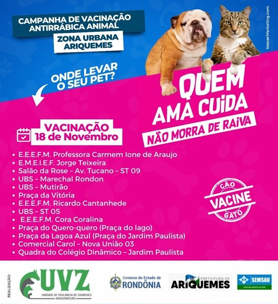 A Prefeitura de Ariquemes, através do Departamento de Vigilância em Saúde e Centro de Controle de Zoonoses, realiza a campanha de vacinação antirrábica animal (cão e gato) na área urbana do município, nos dias 11 e 18 de novembro.