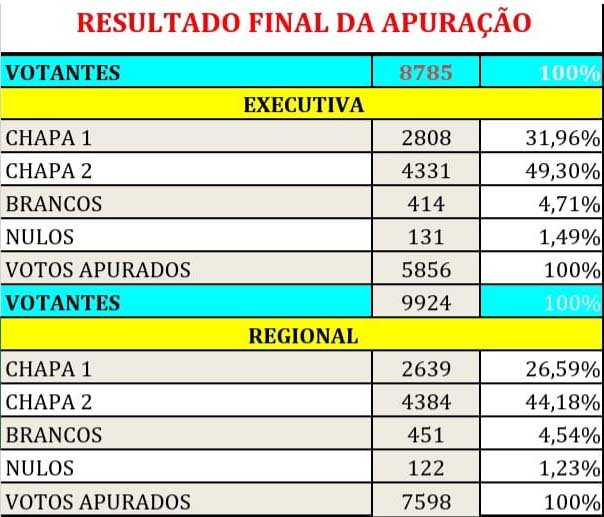 Esse é o resultado extraoficial, obtido durante a contagem dos votos. O resultado oficial será divulgado pela Comissão Eleitoral independente após a análise de todos os boletins de apuração, quando será proclamada a chapa vencedora.
