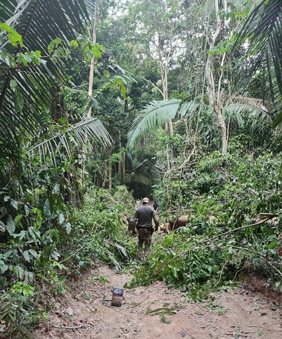 Com a chegada dos policiais, os madeireiros e garimpeiros saíram em fuga. No trajeto, derrubaram mais de vinte espécies de árvores, no intuito de impedir a chegada das equipes até os equipamentos mais valiosos. As barreiras foram rompidas com o uso de motoserras e outros itens de desobstrução de vias terrestres, até que os objetos fossem encontrados e inutilizados.