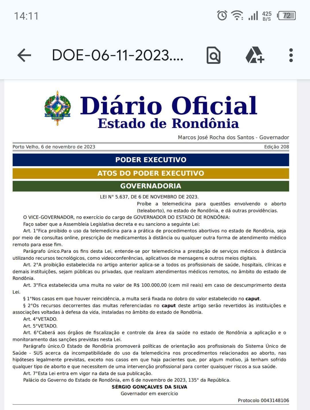 Foi sancionado pelo governo do estado na última segunda-feira, 06, o Projeto de Lei de autoria do deputado Delegado Rodrigo Camargo (Republicanos), aprovado pela grande maioria da Assembleia Legislativa, com votos em contrário das deputadas Ieda Chaves (União) e Cláudia de Jesus (PT), que proíbe a prática do teleaborto. A proibição se aplica a todos os profissionais de saúde, hospitais, clínicas e demais instituições, sejam públicas ou privadas, que realizam atendimentos médicos remotos em Rondônia