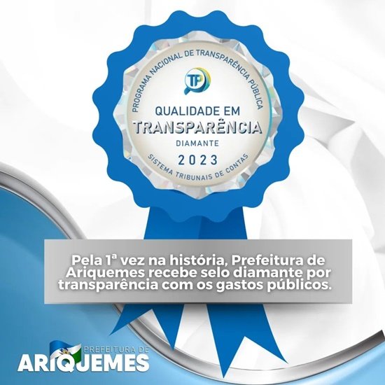 Pela primeira vez, a Prefeitura de Ariquemes recebeu o selo diamante de transparência pública, emitido pelo Programa Nacional de Transparência Pública - ATRICON, uma iniciativa integrada ao Tribunal de Contas da União - TCU. O resultado foi divulgado na manhã desta segunda-feira (13) pela ATRICON.