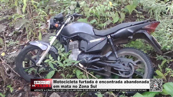 Na manhã de terça, um morador do bairro jardim Zonal Sul durante suas atividades laborais encontrou uma moto Honda Biz de cor preta jogada em um matagal naquele bairro e diante da suspeita informou o fato a Polícia Militar. Uma guarnição ao averiguar a denúncia, encontrou a moto e na consulta veicular constatou que ela havia sido roubada no final do mês passado.