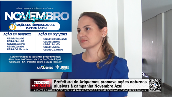 A Prefeitura de Ariquemes, através da Secretaria Municipal de Saúde - Semsau, divulgou nesta quarta-feira (09), o cronograma das ações noturnas nas Unidade Básicas de Saúde - UBS, alusivas à campanha Novembro Azul. A iniciativa tem, por objetivo, fomentar a prevenção ao câncer de próstata.