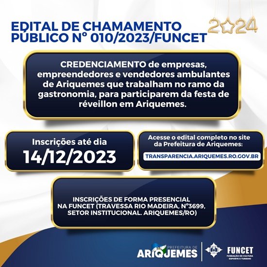 Na manhã desta quarta-feira (29), a Fundação de cultura, Esporte e Turismo - FUNCET, publicou o Edital nº 010/2023 para o credenciamento de empresas, empreendedores e vendedores ambulantes de Ariquemes, que atuam no ramo da gastronomia, para participarem dos festejos da virada de ano que acontecerá no Espaço Alternativo.