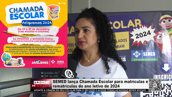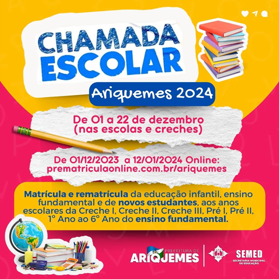 A Prefeitura de Ariquemes, através da Secretaria Municipal de Educação – SEMED lançou nesta quinta-feira (30),o Edital 003/2023, para a chamada escolar, matrículas e rematrículas para o ano letivo de 2024. (EM ANEXO)