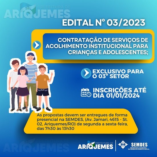 A Prefeitura de Ariquemes, através da Secretaria Municipal de Desenvolvimento Social - SEMDES, divulgou o Edital de Chamamento Público nº 03/2023 que prevê o credenciamento de Organizações da sociedade civil - OSC, para a prestação de Serviços de Acolhimento Institucional para Crianças e Adolescentes - Modalidade Abrigo.