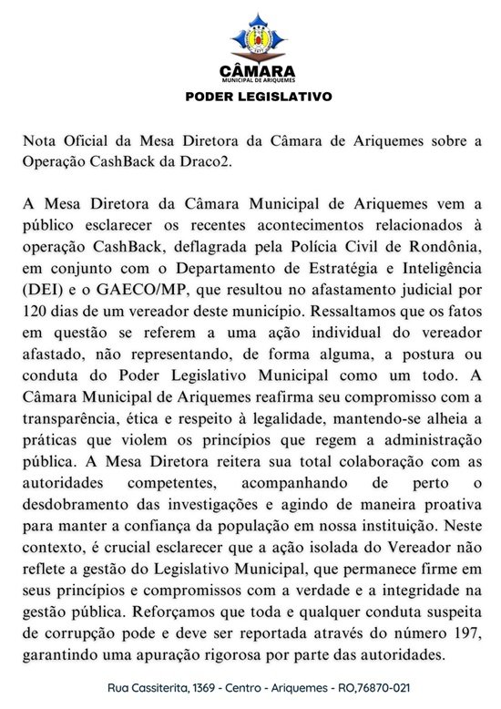 Nota Oficial da Mesa Diretora da Câmara de Ariquemes sobre a Operação CashBack da Draco2.