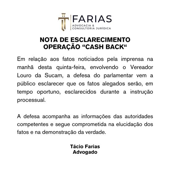 Em relação aos fatos noticiados pela imprensa na manhã desta quinta-feira, envolvendo o Vereador Louro da Sucam, a defesa do parlamentar vem a público esclarecer que os fatos alegados serão, em tempo oportuno, esclarecidos durante a instrução processual.