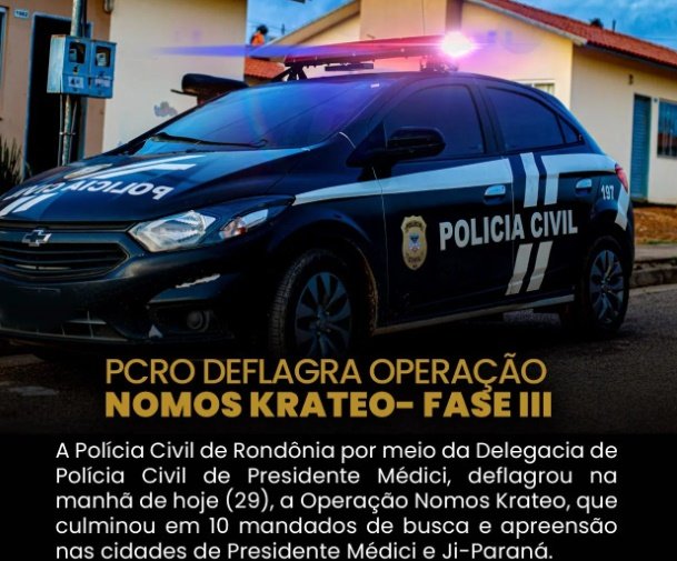 A Polícia Civil de Rondônia por meio da Delegacia de Polícia Civil de Presidente Médici, deflagrou na manhã de hoje (29), a 3ª fase da Operação Nomos Krateo do grego “Domínio da Lei”, que culminou em 10 mandados de busca e apreensão nas cidades de Presidente Médici e Ji-Paraná.