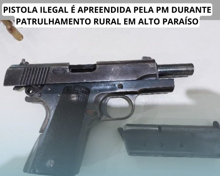 A Polícia Militar durante o patrulhamento rural, em Alto Paraíso, tirou de circulação uma arma de fogo irregular. A pistola calibre 380 e munições estavam dentro de um automóvel. Um homem foi detido.