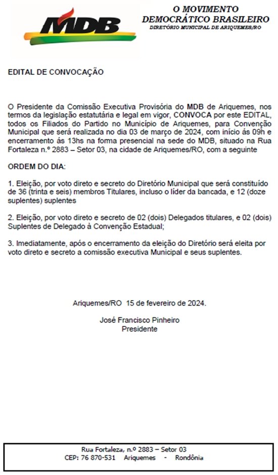 ARIQUEMES: Partido MDB expede Edital convocando afiliados para convenção municipal