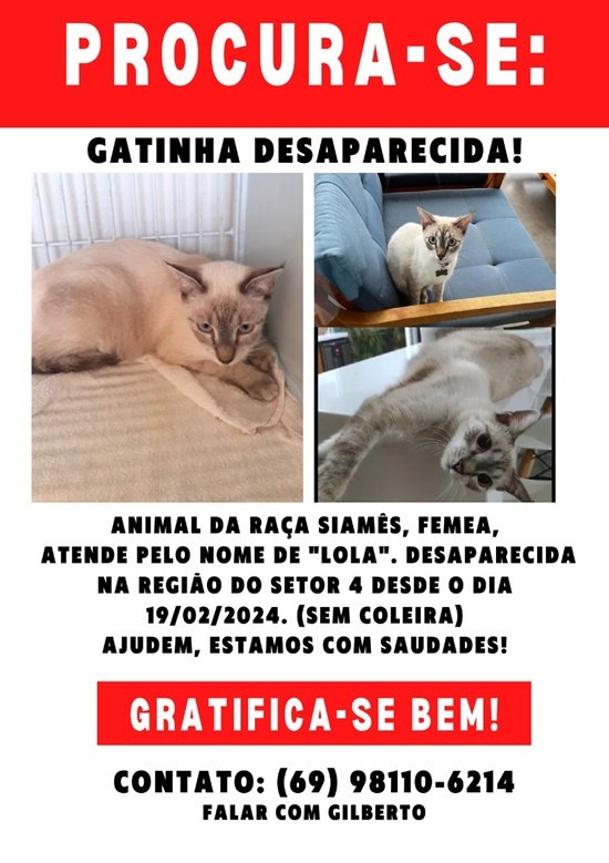 Essa gatinha , da raça Siamês, que atende pelo nome de Lola, desapareceu na região do Setor 04 em Ariquemes, nesta Segunda-feira, 19/02. Quem tiver informações do paradeiro da Lola, entrar em contato com Gilberto pelo telefone: 69 9 98110 - 6214.