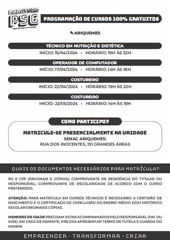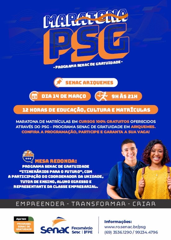 Pra você que estava querendo se especializar através de um curso profissionalizante, mas não estava conseguindo porque a grana tá curta, preste atenção nesse recado, porque é hoje, 14/03, a Maratona PSG do SENAC, com cursos 100% gratuítos, confira a progamação.