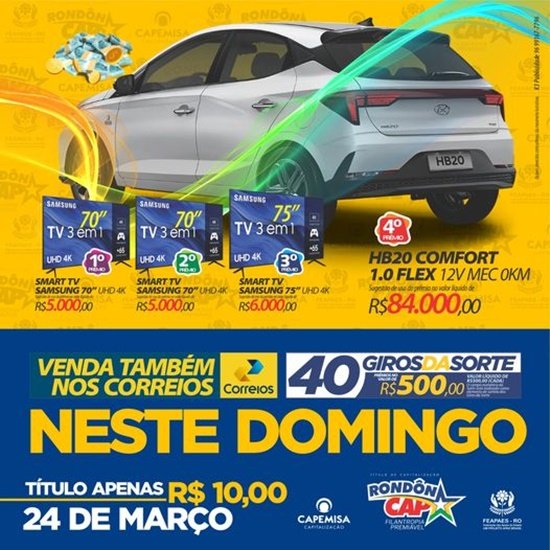 Neste domingo o RondônCap vai sortear um HB20 0km no valor de R$84Mil reais, 3 Smarts TV’s, nos 1º e 2º prêmios no valor de R$5Mil reais cada e no 3º prêmio no valor de R$6Mil reais! Além dos 40 giros da sorte de R$500 reais, cada!