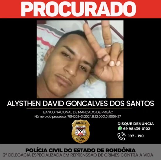 Ajude-nos a localizar ALYSTHEN DAVID GONÇALVES DOS SANTOS. Atualmente, encontra-se foragido, com mandado de prisão em aberto. Ele é procurado pela Polícia Civil de Rondônia.