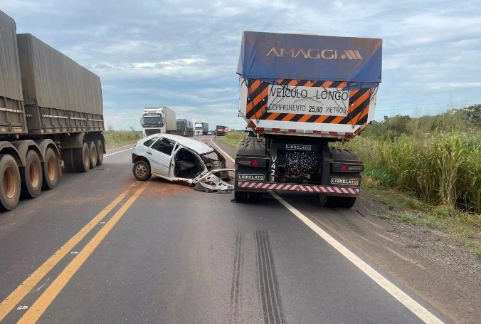 Uma forte batida envolvendo um carro modelo Gol e uma carreta resultou em uma vítima fatal e outra gravemente ferida.