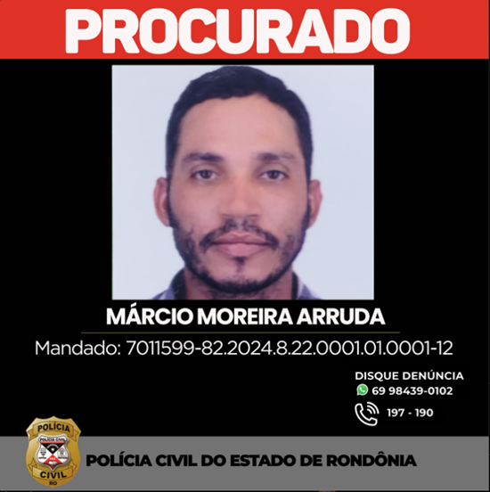 A Polícia Civil de Rondônia informa que, após investigações conduzidas pela Delegacia Especializada em Crimes Contra a Vida de Porto Velho, o suspeito MÁRCIO MOREIRA ARRUDA, acusado de FEMINICÍDIO, não foi localizado, estando portanto foragido, com mandado de prisão em aberto.
