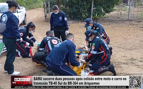 SAMU socorre 2 após colisão entre carro e moto no travessão TB-40 Sul da BR-364, em Ariquemes - Vídeo