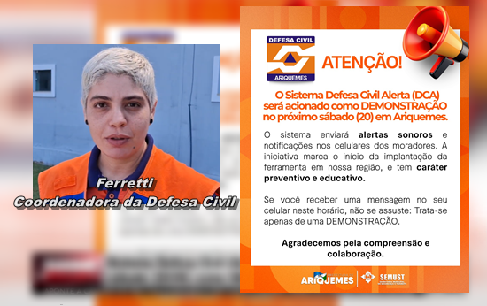 Sistema Defesa Civil Alerta (DCA) será acionado neste sábado 20/09 como demonstração em Ariquemes - Vídeo