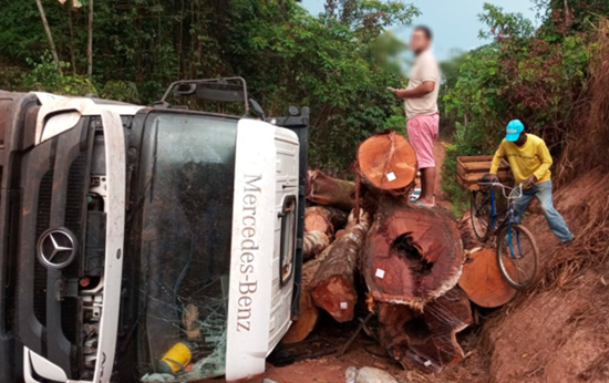 Um caminhão carregado com toras de madeira tombou no início da noite desta quarta-feira (24) na estrada da Bacia Leiteira, linha 42, em Porto Velho, após uma manobra do motorista para evitar colisão frontal com um ônibus escolar. O acidente deixou o condutor ferido e bloqueou totalmente a via.