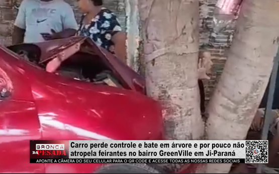 Carro perde o controle, bate em árvore e quase atropela feirantes no bairro GreenVille – Vídeo