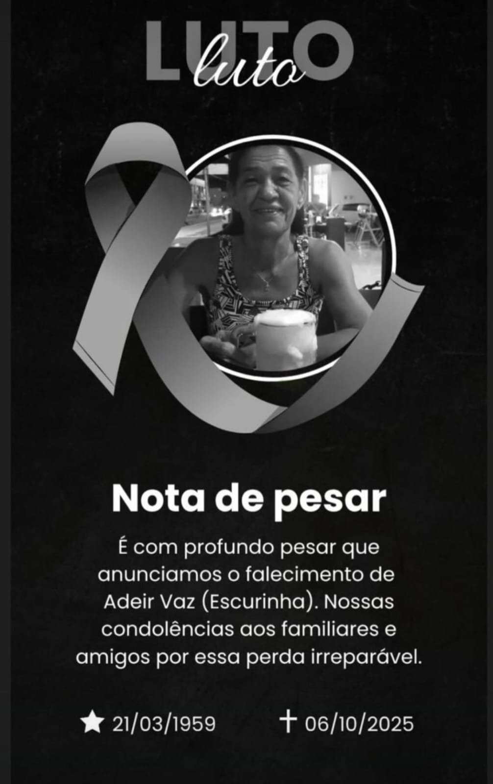 É com grande pesar que a família de Adeir Vaz, 66 anos, mais conhecida popularmente como Escurinha, comunica seu falecimento ocorrido nesta segunda-feira, 06/10/25. Que o Deus Criador console familiares e amigos nesse momento de dor.