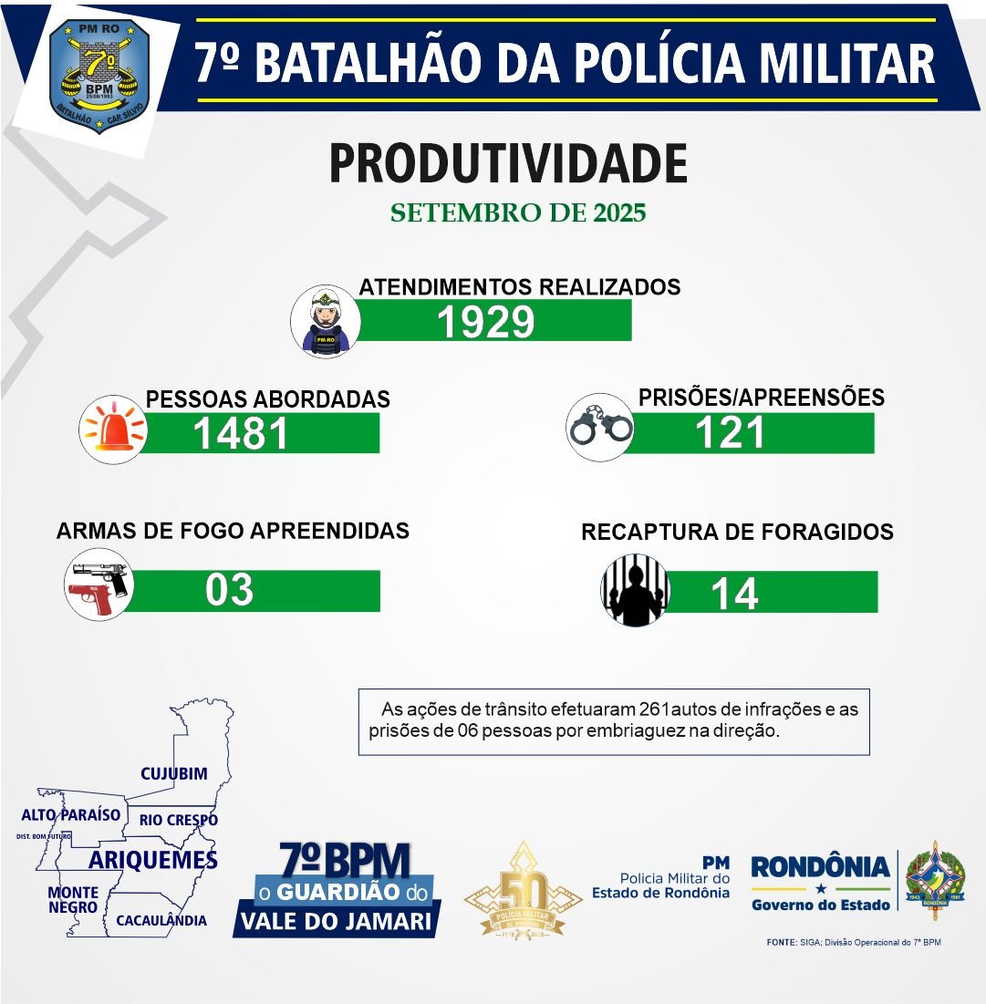 O 7º Batalhão da Polícia Militar de Rondônia divulga o balanço operacional referente a setembro de 2025, evidenciando o intenso trabalho das guarnições que atuam no Vale do Jamari. Com 1.929 atendimentos realizados, 1.481 pessoas abordadas e 121 prisões e apreensões, os números demonstram o comprometimento da tropa e o tirocínio policial empregados nas ações preventivas e repressivas ao longo do mês.