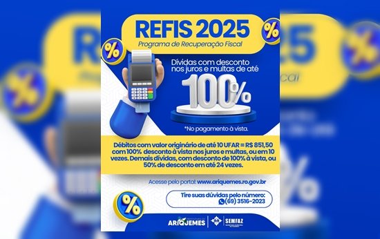 A Prefeitura de Ariquemes, por meio da Lei nº 2.972, de 8 de outubro de 2025, instituiu o Programa de Recuperação Fiscal – Refis 2025, com o objetivo de incentivar a regularização de débitos municipais e oferecer condições especiais de pagamento a pessoas físicas e jurídicas.