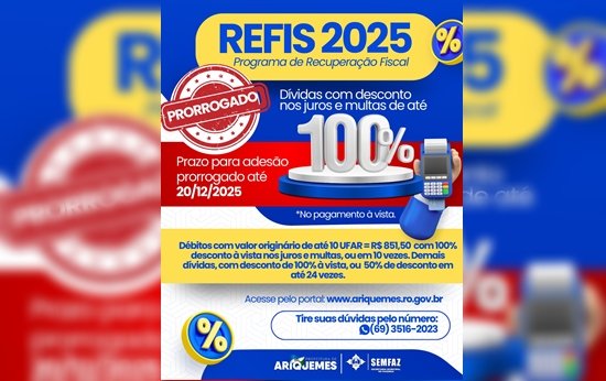 A Prefeitura de Ariquemes prorrogou o prazo para adesão ao Programa de Recuperação Fiscal – Refis 2025, com o objetivo de incentivar a regularização de débitos municipais e oferecer condições especiais de pagamento a pessoas físicas e jurídicas.