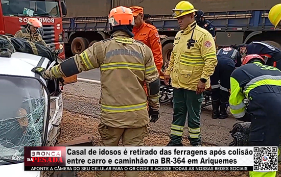 Casal de idosos é retirado das ferragens após colisão entre carro e caminhão na BR 364 em Ariquemes- Vídeo