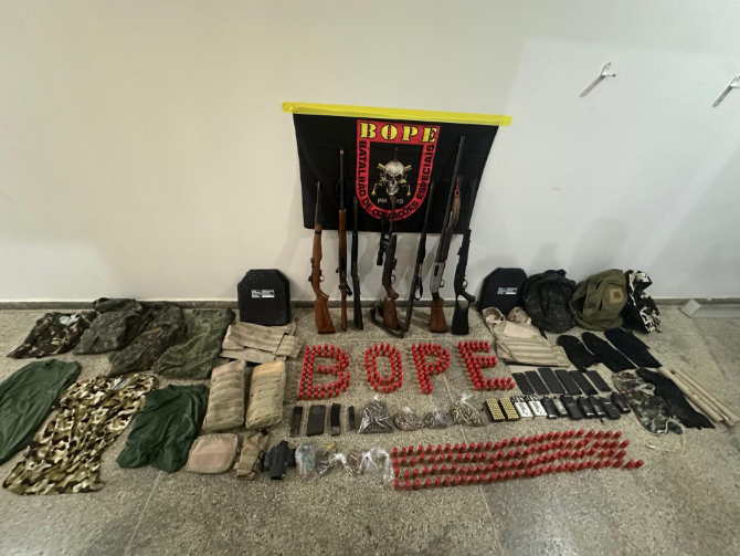 No local da ocorrência, os policiais apreenderam uma pistola Glock calibre 9mm com a numeração suprimida, 16 munições, além de uma mochila camuflada que continha mais 56 munições e uma camisa camuflada, material frequentemente utilizado para ocultação em áreas de mata.